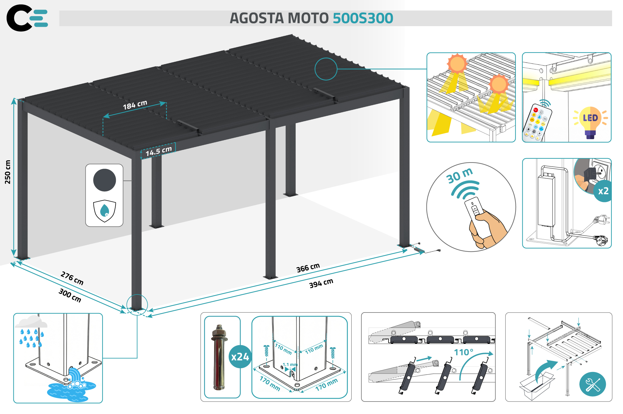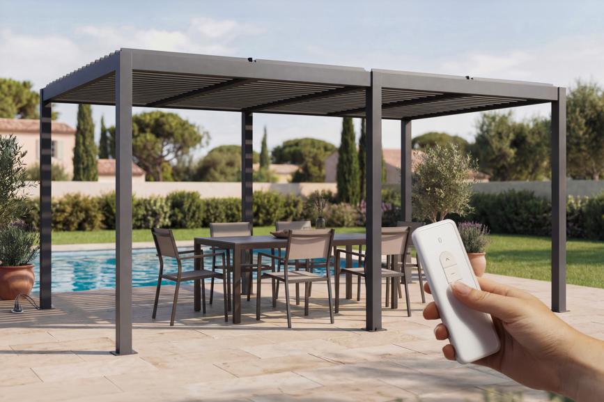 Οι ρυθμιζόμενες περσίδες της, που κυμαίνονται από 0 έως 110°, μπορούν να ελεγχθούν εξ αποστάσεως χρησιμοποιώντας τα δύο τηλεχειριστήρια που περιλαμβάνονται, επιτρέποντάς σας να ρυθμίσετε εύκολα το ηλιακό φως και τον αερισμό σύμφωνα με τις προτιμήσεις σας. Το βράδυ, η ενσωματωμένη ταινία LED σας επιτρέπει να απολαμβάνετε τον εξωτερικό χώρο σε μια ευχάριστη, φωτεινή ατμόσφαιρα. Το ανθρακί γκρι χρώμα της παρέχει ένα συνεκτικό και εκλεπτυσμένο φινίρισμα που συνδυάζεται άψογα με όλα τα σύγχρονα αρχιτεκτονικά στυλ.