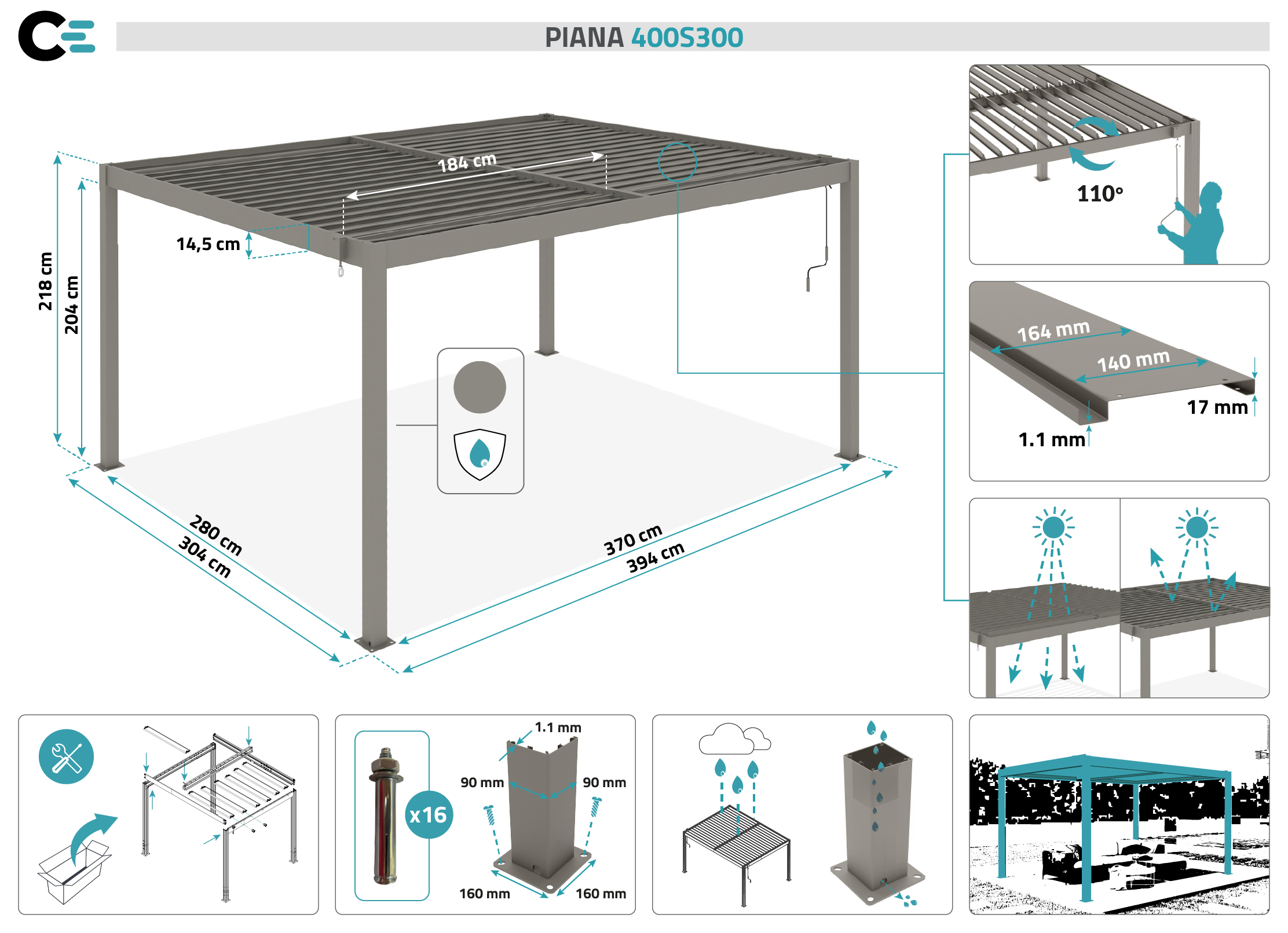 Σχεδιασμένη για να απλοποιήσει τη ζωή σας, η μοντέρνα πέργκολα PIANA είναι εξοπλισμένη με ρυθμιζόμενες χαλύβδινες τάβλες οροφής. Στην ανακλινόμενη θέση, επιτρέπουν την κυκλοφορία του αέρα ενώ φιλτράρουν τις ακτίνες του ήλιου. Ένα ελαφρύ ντους; Κλείστε τις με μια απλή κίνηση χρησιμοποιώντας τη μανιβέλα για ένα πλήρως αδιάβροχο κάλυμμα. Η αυτοστηριζόμενη δομή της, στιβαρή και καλά αγκυρωμένη, μπορεί να αντέξει ανέμους έως και 70 χλμ./ώρα. Ιδανική για να στεγάσετε τα γεύματά σας, το διάβασμα ή τα καλοκαιρινά βράδια, ανεξάρτητα από τον καιρό.